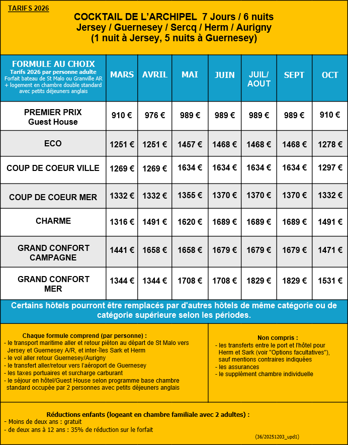 • les transferts entre le port et l’hôtel dans chaque île (sauf pour l’excursion à Aurigny pour lesquelles il est prévu une prise en charge à votre hôtel)