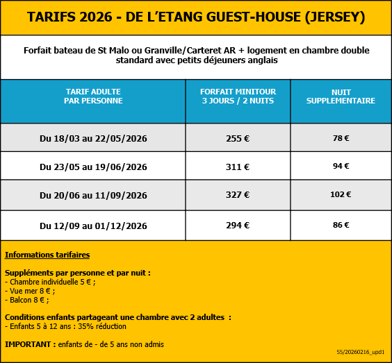 Réduction pour les enfants ne partageant pas la chambres de 2 adultes : – 21€ sur la compagnie CONDOR ( -16ans) et -20€ sur la compagnie MANCHE ILES EXPRESS (-15ans)