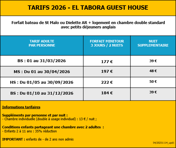 Une hausse carburant sera à ajouter pour les départs et retours (Granville, Carteret et Diélette) : 2 €/personne/trajet simple (A ce jour – sous réserve de modifications).