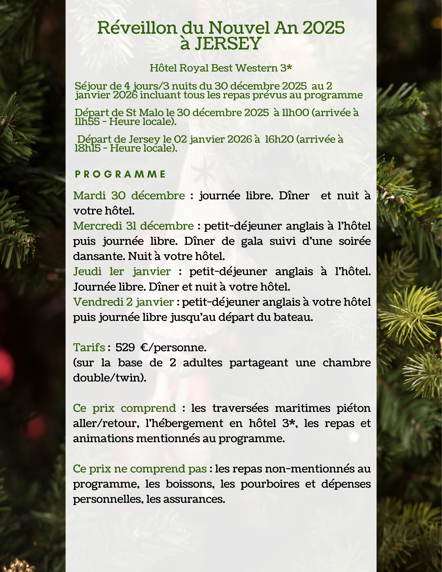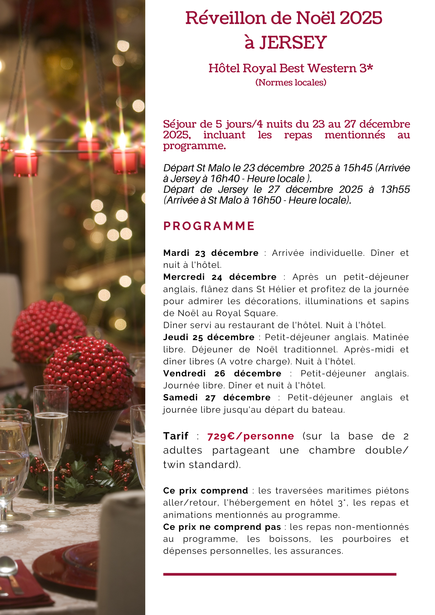 En fonction des liaisons maritimes St Malo/Jersey, les séjours sont de 4 nuits à Noël (horaires des traversées ci-dessous). Possibilité d’agrémenter votre séjour d’une ou plusieurs nuits supplémentaires.